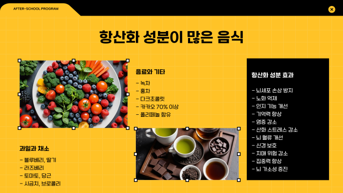 - 항산화 성분 (블루베리, 토마토, 녹차) → 뇌세포 보호