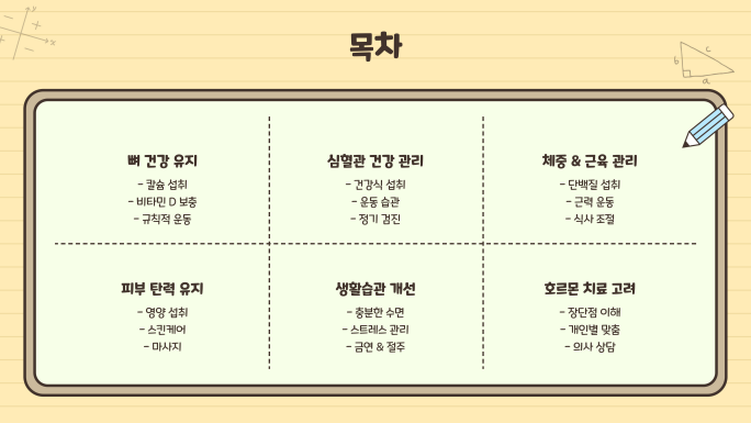 ✔ 뼈 건강 & 심혈관 관리 → 칼슘, 비타민D, 오메가3 섭취 & 운동 필수