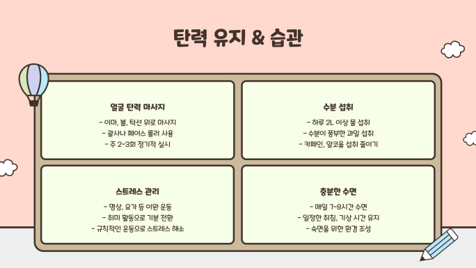 💡 TIP: 술과 흡연은 피부 탄력을 급격히 저하시킬 수 있으므로 피하는 것이 좋습니다.