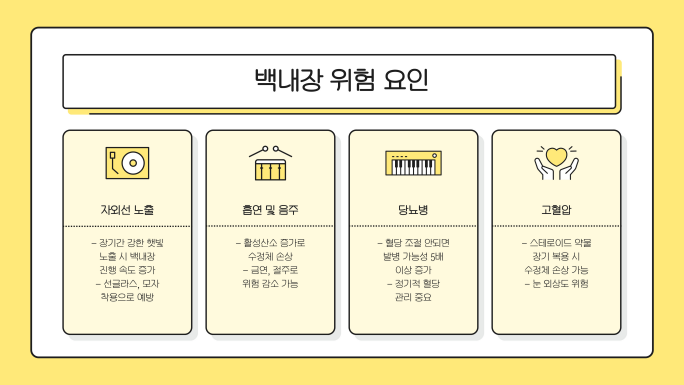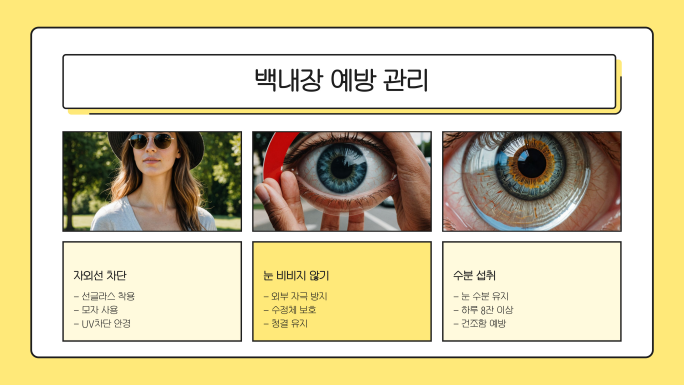 💡 TIP: 자외선 차단 안경을 착용하고, 금연 및 혈당 관리를 통해 백내장 위험을 줄일 수 있습니다.