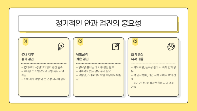 💡 TIP: 40대부터는 정기적인 안과 검진(1~2년마다)을 받아 조기 진단하는 것이 중요합니다.