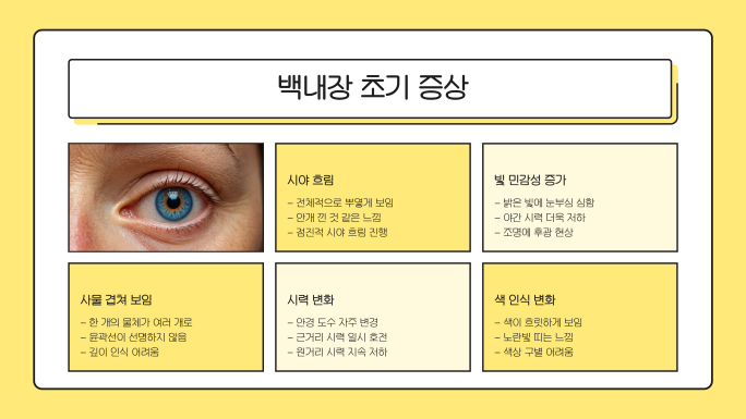 💡 TIP: 위와 같은 증상이 있다면 안과에서 정밀 검진을 받아 백내장 여부를 확인하는 것이 중요합니다.