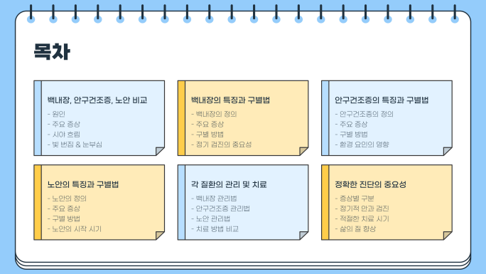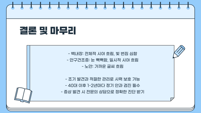| 치료 방법 | 초기에는 항산화 안약, 진행 시 수술 필요 | 인공눈물, 안구건조증 치료제, 생활습관 개선 | 돋보기, 다초점 렌즈, 백내장 진행 시 수술 고려 |